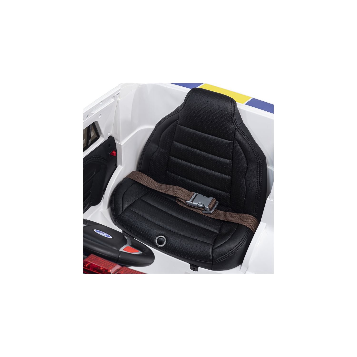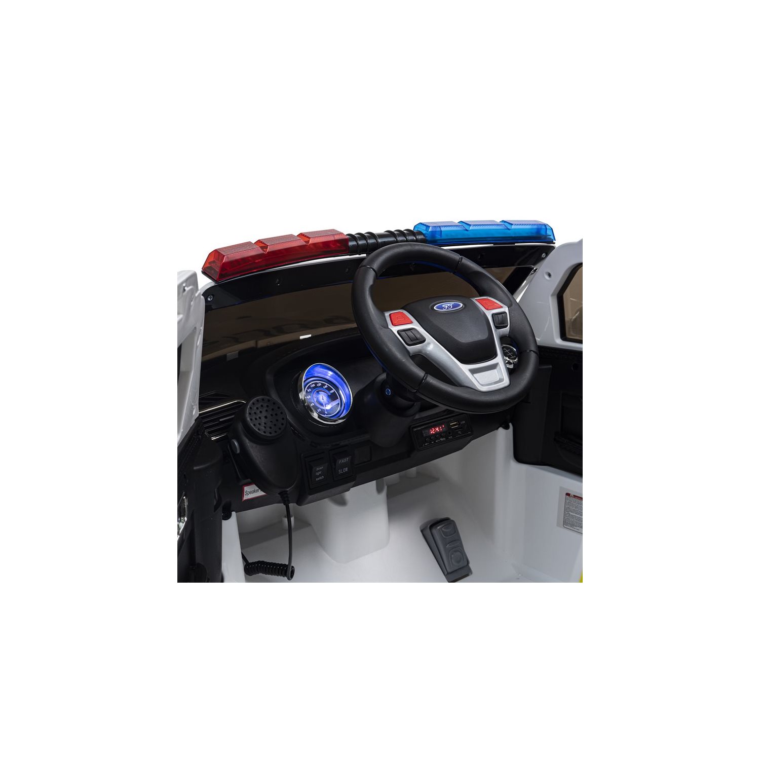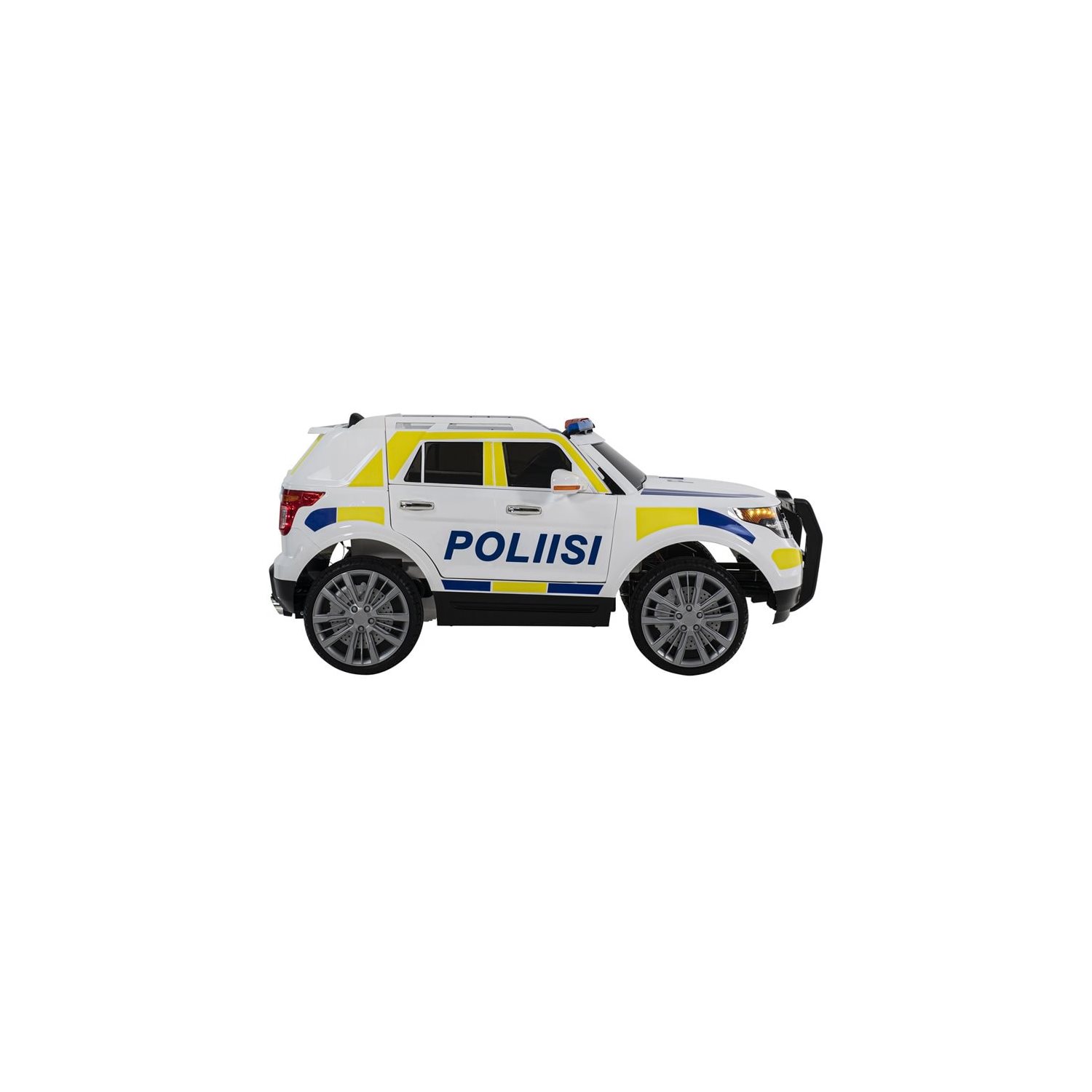 Tuff polisbil i SUV-utförande med fungerande blåljus, stötdämpning för hjulen, öppningsbara dörrar, gummidäck m.m. Dessutom har bilen en mikrofon så att den lille konstapeln kan ropa ut varningar till omgivningen och fungerande blåljus! Bilen har dubbla motorer om 35W/st samt tre hastigheter framåt och backväxel. Fjärrkontroll 2,4G ingår. Mjuk start/stopp. Tuff polisbil i SUV-utförande med fungerande blåljus, stötdämpning för hjulen, öppningsbara dörrar, mjuka däck i skumplast LED-lysen fram och bak m.m. Dessutom har bilen en mikrofon så att den lille konstapeln kan ropa ut varningar till omgivningen. Separat knapp finns för att slå på blåljusen och polissirenen när det är dags att ge sig iväg för att jaga bovar! Inbyggd stereo med ett gäng förinspelade låtar samt möjlighet att ansluta MP3-spelare via medföljande sladd (3,5 mm kontakt). Bilen har dubbla motorer om 35W/st samt tre hastigheter framåt och backväxel. Fjärrkontroll 2,4G ingår. Mjuk start/stopp. Elbil Polisbil har dubbla motorer om 35W/st vilket gör att båda bakhjulen driver. Detta gör att bilen tar sig fram även på grus och klippta gräsmattor. Bilen drivs av ett 12V 7Ah återladdningsbart batterier och laddas med medföljande 12V-laddare. En laddning om 6-8 timmar ger upp till 60-90 minuters "lektid". Antingen kan bilen köras av barnet själv eller styras av föräldern med medföljande fjärrkontroll. Att köra bilen är enkelt: gasa med gaspedalen sedan stannar bilen av sig själv när man släpper gasen. Polisbilen är försedd med mjuk start, vilket ger en mindre ryckig drift jämfört med enklare modeller. Bilen kan köras på egen hand från ca: 3 års ålder, yngre barn kan skjutsas av föräldern med fjärrkontrollen. Du som förälder kan enkelt ställa in ett av tre hastighetslägen för bilen för att anpassa toppfarten efter ditt barns ålder. OBS! Polisbilen kommer i en svensk design men med finsk text "Poliisi". Elbilen levereras i kartong och fordrar viss montering innan användning. Monteringsanvisning på svenska medföljer. Rekommenderas från 3 år. Använd endast under tillsyn av vuxen. Används ej i trafik. Använd ej nära stup eller vattendrag.