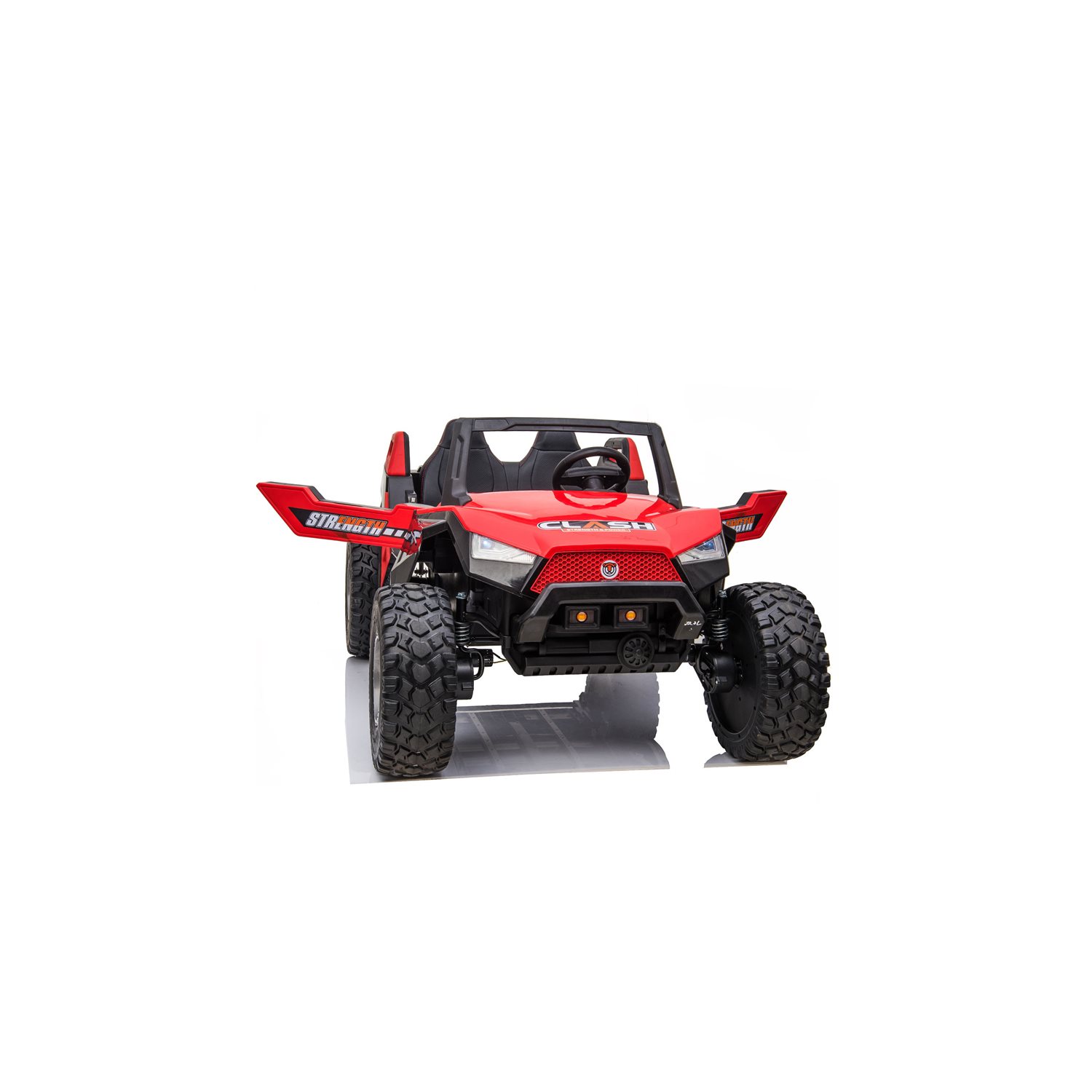 Alla barn som tycker om att köra elbil vid sidan av asfalt- eller grusplanen - titta hitåt! Här har vi en stentuff UTV med ÄKTA FYRHJULSDRIFT och dessutom plats att ta med kompisen på en åktur. Denna elbil är verkligen fräck till utseendet. Den är stor och rymlig, har rejäl hjuldiameter och tuffa detaljer som LED-belysning, öppningsbara dörrar och stötdämpning för bakhjulen. Dessutom har denna bil solida EVA-däck, vilket ger tystare drift samt lång livslängd. Givetvis finns säkerhetsbälte för båda sittplatserna. Modellen är dessutom utrustad med mjuk start vilket ger behagligare och mindre ryckig drift för den lille bilentusiasten. Bilen drivs av ett stort batteri med 12V 10Ah kapacitet, bestående av dubbla återladdningsbara blyackumulatorer. En laddning om ca: 10-12 timmar ger upp till 60 minuters ""lektid"" beroende på körstil. Antingen kan bilen köras av barnet själv eller styras av föräldern med medföljande fjärrkontroll. Att köra bilen är enkelt: gasa med gaspedalen sedan stannar bilen av sig själv när man släpper gasen. Bilen kan köras på egen hand från ca: 2-3 års ålder, yngre barn kan skjutsas av föräldern med fjärrkontrollen! Bilen är utrustad med fyra motorer om 35W/st (total motoreffekt hela 140 Watt!) som ger god framkomlighet och kraft samt en toppfart om ca 6 km/h. Framkomligheten på gräsmattor går inte att jämföra med elbilar som har en eller två motorer! Tre hastighetslägen finns som du ställer in genom fjärrkontrollen. Även backväxel finns. Elbilen levereras i kartong och fordrar viss montering innan användning. Monteringsanvisning på svenska medföljer.Laddare och batteri medföljer. Rekommenderas från 3 år. Använd endast under tillsyn av vuxen. Används ej i trafik. Använd ej nära stup eller vattendrag. *Bilderna stämmer inte helt överens med verkligheten. På bilderna syns lädersäten medan denna levereras med säten i plast.