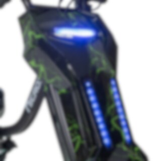 En riktig höjdpunkt är belysningen, färgglada LED-ljus i hjulen och under sitsen skapar ett riktigt coolt intryck, både i dagsljus och i mörker. Dessutom finns en framåtriktad LED-lampa som lyser upp vägen vid körning i skymning.