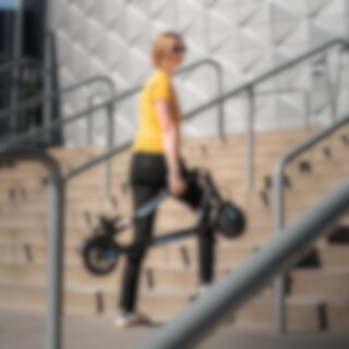 Denna elsparkcykel har en kompakt och lättviktig design, vilket gör den enkel att hantera och transportera. Med sin eleganta svart/blå eller svart/grå färgkombination sticker den ut i mängden. Den är också utrustad med en praktisk LCD-display som visar hastighet och batteristatus.
